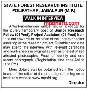 - MP SFRI Bharti -वॉक-इन-इंटरव्यू 2026: जूनियर रिसर्च फेलो और प्रोजेक्ट असिस्टेंट भर्ती, सीधी चयन प्रक्रिया