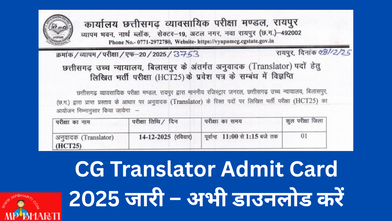 CG Vyapam Translator Admit Card 2025 CG High Court Translator Admit Card Link: vyapamcg.cgstate.gov.in छत्तीसगढ़ व्यावसायिक परीक्षा मण्डल (CG Vyapam), रायपुर द्वारा माननीय रजिस्ट्रार जनरल, छत्तीसगढ़ उच्च न्यायालय, बिलासपुर से प्राप्त प्रस्ताव के आधार पर अनुवादक (Translator) पदों पर भर्ती हेतु लिखित परीक्षा (HCT25) का आयोजन दिनांक 14 दिसंबर 2025 (रविवार) को किया जाएगा। यह … Read more
