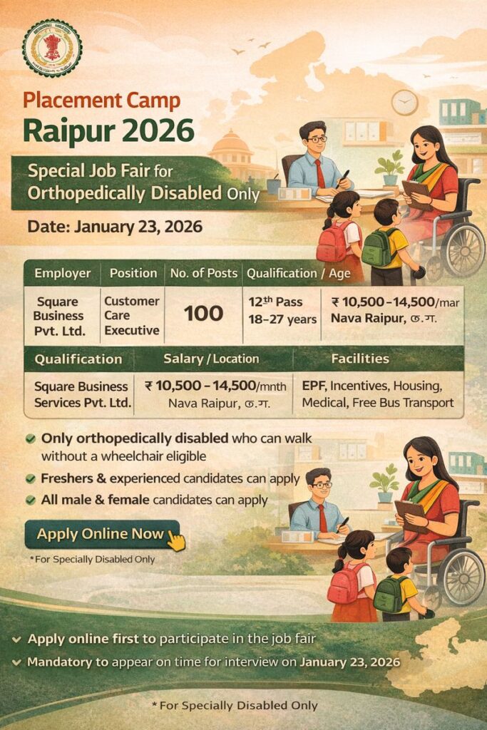 Rojgar Mela Raipur 2026 is being organized to provide employment opportunities to eligible candidates in the private sector. Square Business Services Pvt. Ltd. is offering 100 vacancies for the post of Customer Care Executive. Candidates who have passed 12th class and fall within the age group of 18 to 27 years can participate in this employment fair. The offered salary ranges from ₹10,500 to ₹14,500 per month along with additional benefits such as EPF, incentives, housing, and medical facilities. This recruitment drive is specially conducted for differently abled candidates, and basic English communication skills are required. The job location will be Nava Raipur, Chhattisgarh.