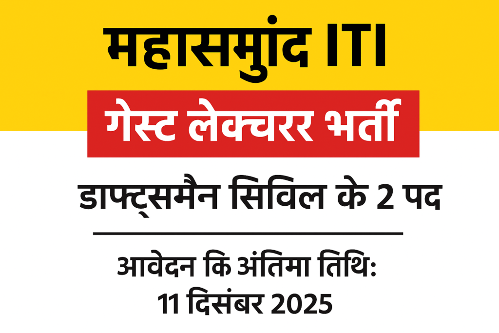 ITI Mahasamund Recruitment: संचालनालय, रोजगार एवं प्रशिक्षण छत्तीसगढ़, अटल नगर नवा रायपुर के निर्देशों के तहत जिले महासमुंद में स्थित शासकीय औद्योगिक प्रशिक्षण संस्था, बसना में ड्राफ्ट्समैन सिविल ट्रेड के लिए प्रशिक्षण सत्र 2025-26 हेतु मेहमान प्रवक्ता (Guest Lecturer) के पदों पर आवेदन आमंत्रित किए गए हैं। इच्छुक एवं योग्य अभ्यर्थी अपना आवेदन निर्धारित प्रारूप में प्राचार्य, शासकीय आईटीआई लभराखुर्द, जिला महासमुंद के पते पर केवल स्पीड पोस्ट या पंजीकृत डाक के माध्यम से भेज सकते हैं। आवेदन जमा करने की अंतिम तिथि 11 दिसंबर 2025 (गुरुवार) शाम 5:00 बजे तय की गई है। निर्धारित समय के बाद प्राप्त आवेदन स्वीकार नहीं किए जाएंगे।
