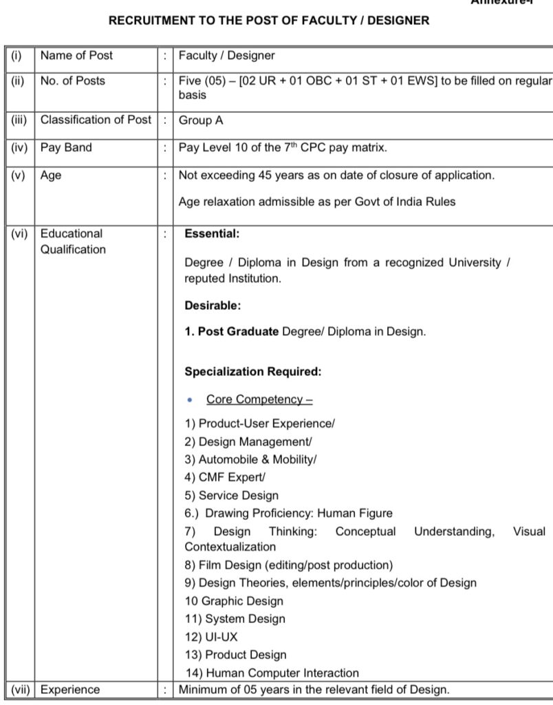 | 6 | शैक्षणिक योग्यता | अनिवार्य: मान्यता प्राप्त विश्वविद्यालय/संस्थान से डिज़ाइन में डिग्री/डिप्लोमा वांछनीय: पोस्ट ग्रेजुएट डिग्री/डिप्लोमा |