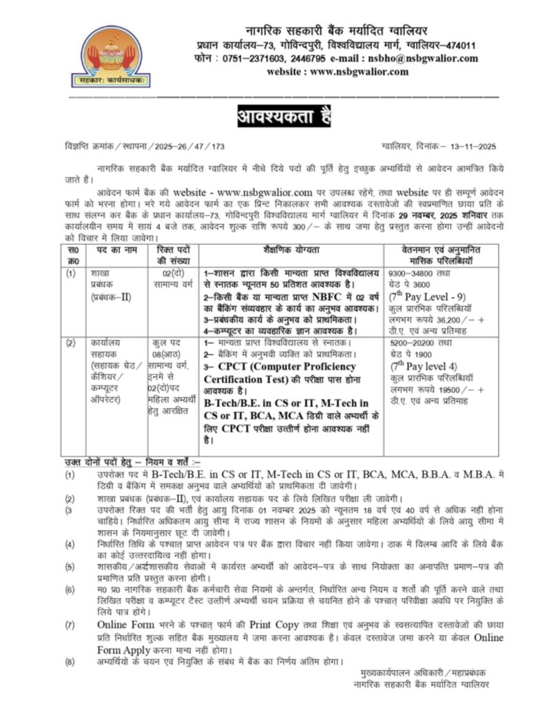 NSB Gwalior Bharti: www.nsbgwalior.com Bharti Nagarik Sakahari Bank, Gwalior has released a new recruitment notification for the posts of Office Assistant and Branch Manager. Candidates who wish to build a career in the banking sector have a great opportunity to apply. The NSB Gwalior online application process begins on 1 November 2025 and will remain open till 29 November 2025. The same date is also the last day for fee payment. The interview will be conducted as per the official schedule announced later. Get More details about NSB Gwalior Bharti like education details, age limit and Nagari Sahakari Bank Gwalior Bharti 2025