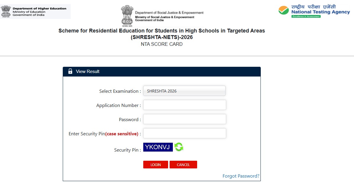 2. Score Cards of the exam is hereby released today i.e. 03.01.2026 and hosted on https://exams.nta.nic.in/shreshta/. Candidates can login to the website and view/download/print their respective score card using their Application Number & Password.